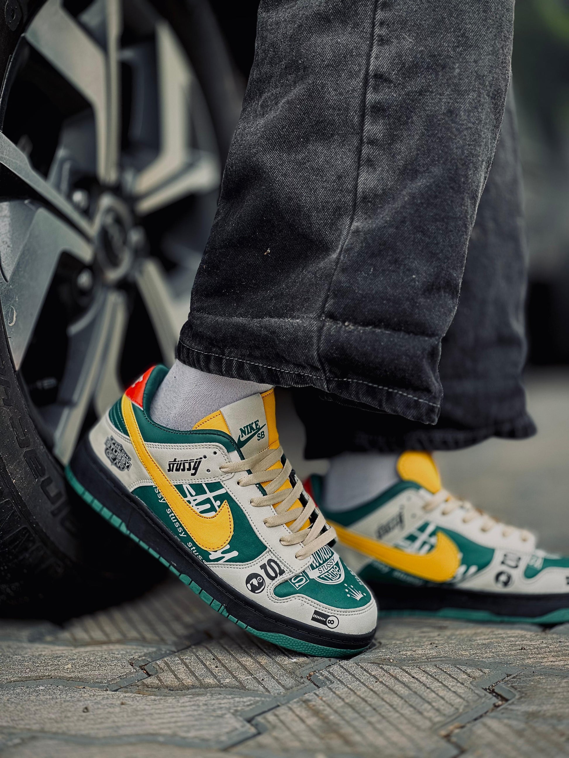 This bold pair features an all-over graphic treatment with vintage Stüssy logos, Nike SB detailing, and retro vibes that scream 90s skate culture. The rich mix of forest green, canary yellow, cream white, and black accents gives it a standout appeal—whether you’re hitting the skate park or making a statement on the street.